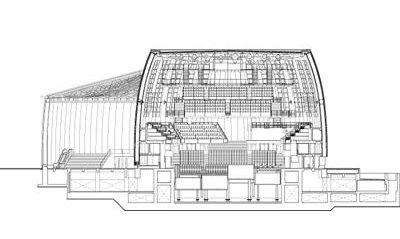 Para facilitar la difusión del sonido, el techo es ligeramente curvo y presenta una superficie tratada como una red con nichos para la iluminación y la absorción del sonido. El espacio situado entre la caja de cristal y la concha externa alberga un recibidor y un bar, desde el que es posible ver el panorama de todo el espacio iluminado con luz natural.